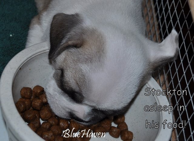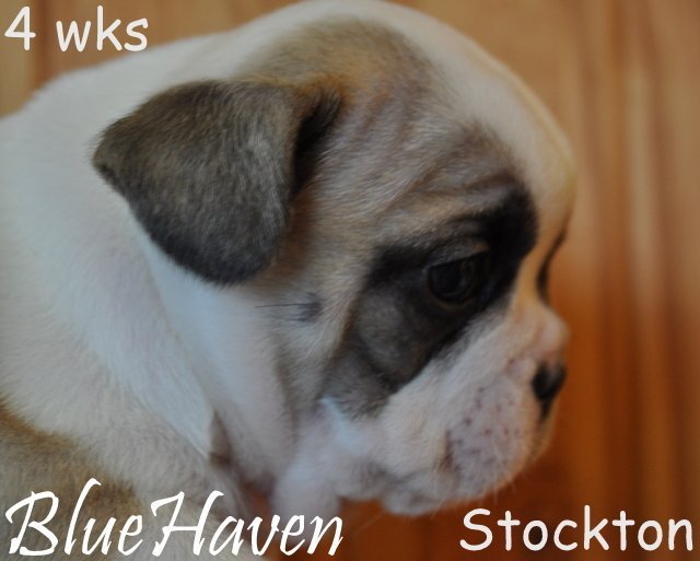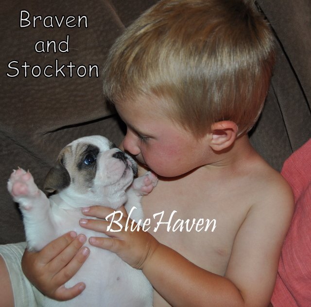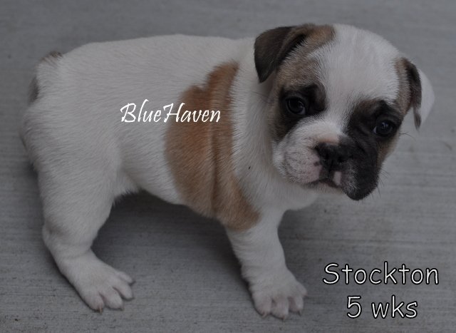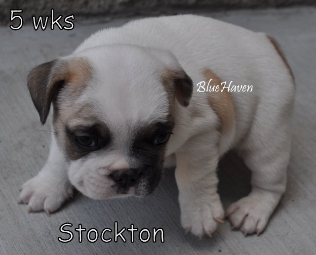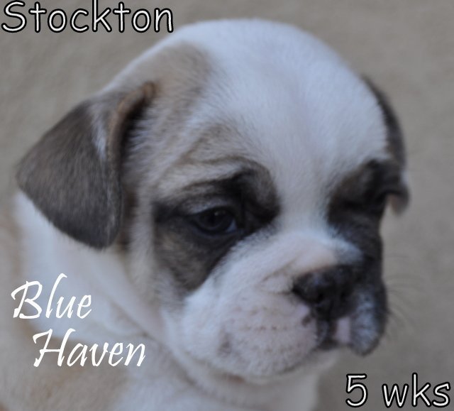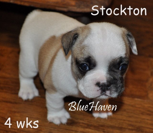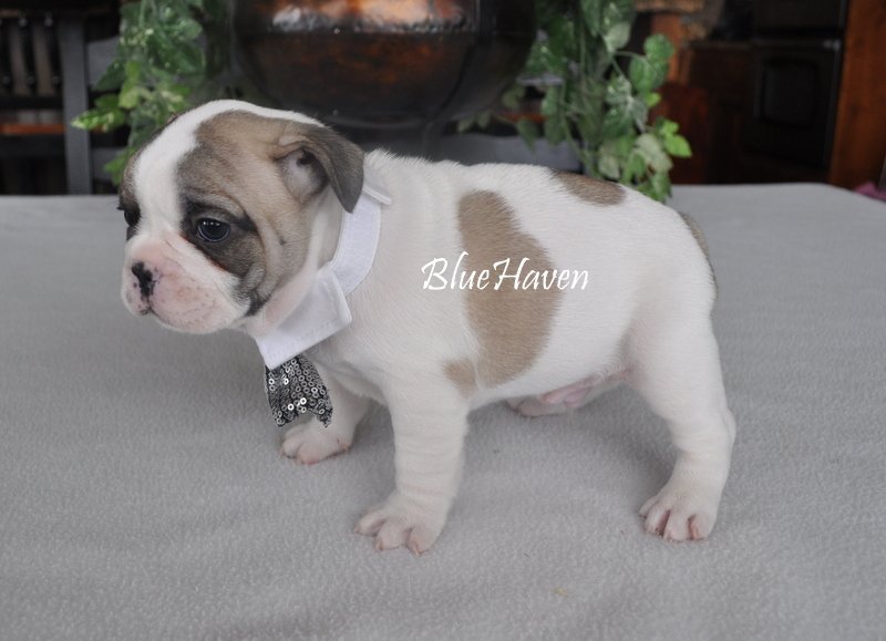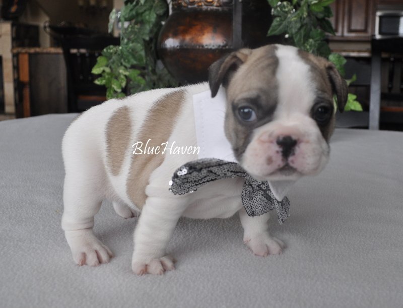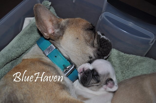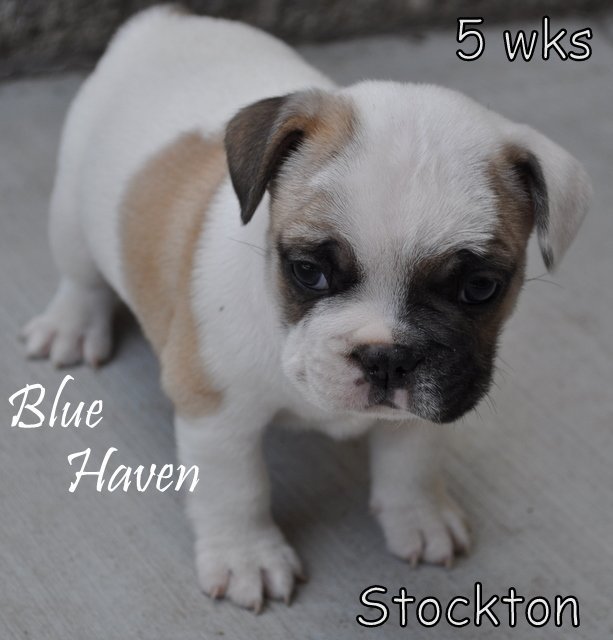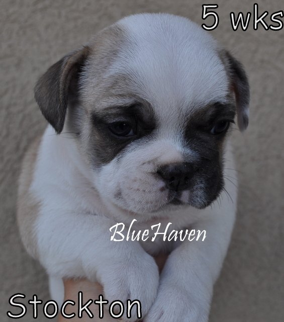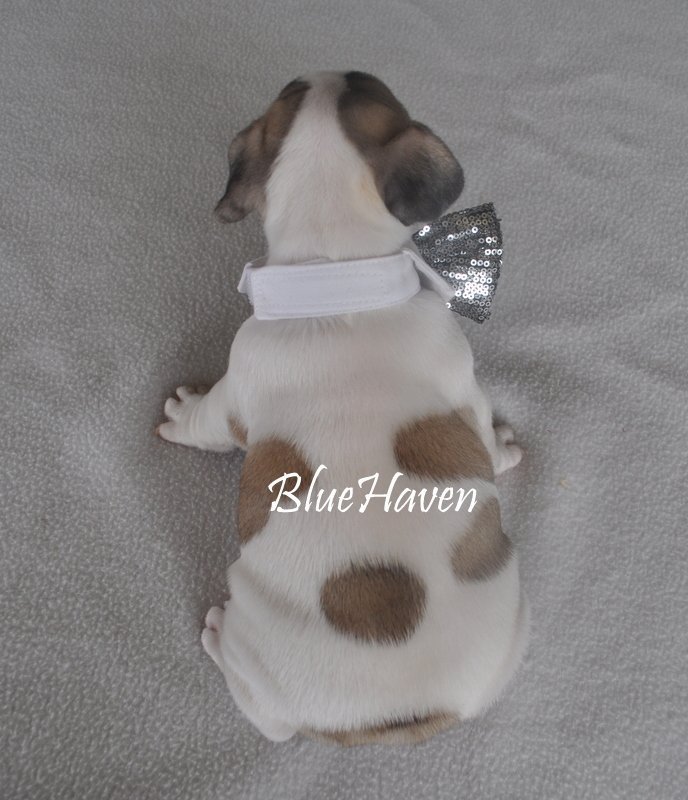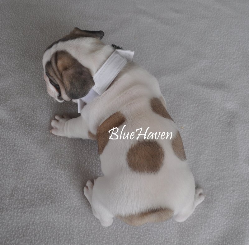 Many people just love the pieds because no two are alike – they all have their own distinct patterning. Fawn pied Frenchies are basic white and contain various numbers and patterns of fawn patches (which patches can be varying shades of fawn, even varying on the same Frenchie). Some pieds have only a few patches while others have several. Some of the patches are small (silver dollar size) making these Frenchies mostly white while others have large patches which meld into other patches making these Frenchies more fawn than white. Some of the fawn pieds have a black mask while others have lighter masks. There is a gorgeous heavy red fawn pied named Kate in this litter that you can see at the 2:35 mark.